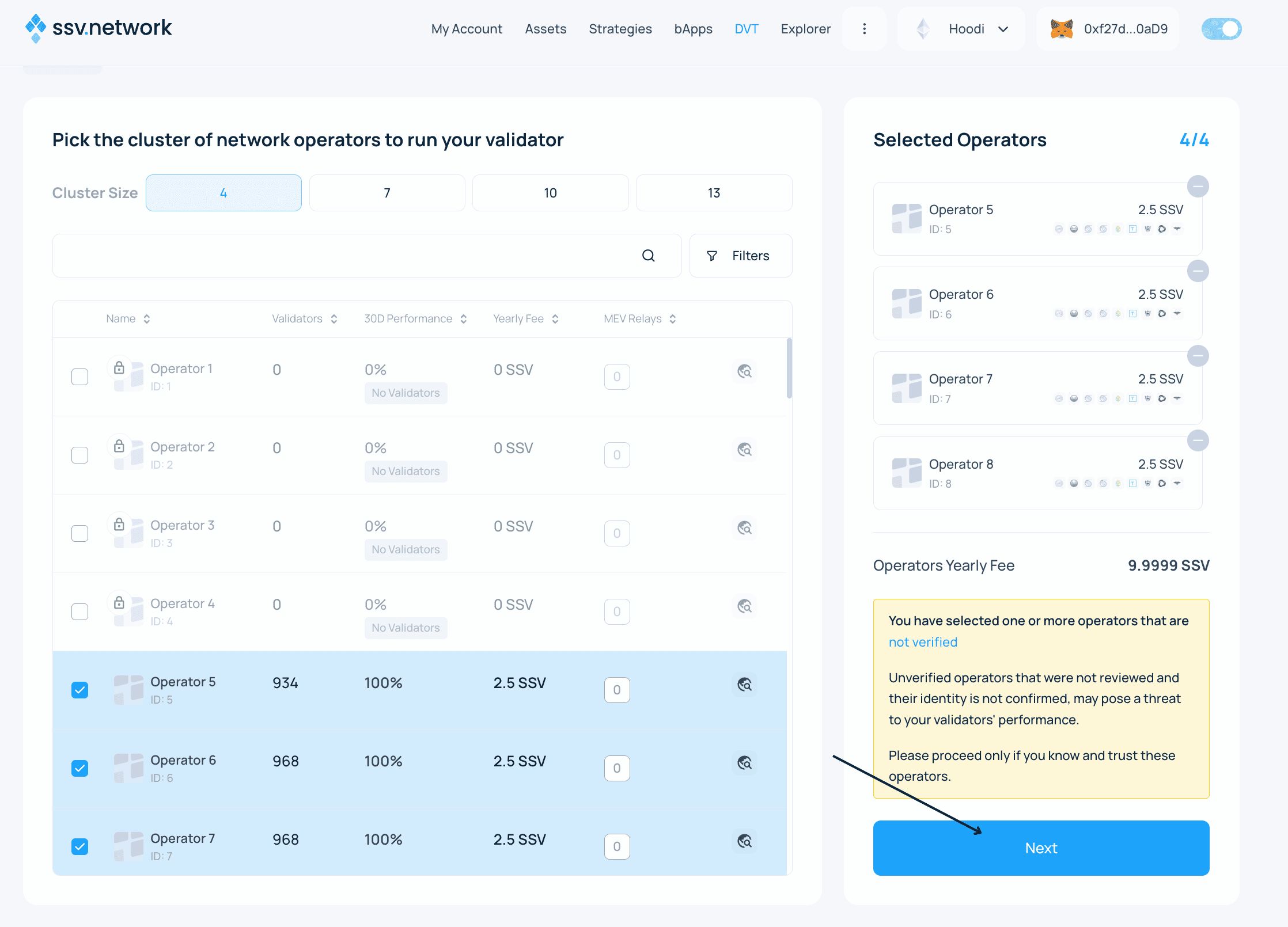 - Choose the cluster size and operators to run your validator, and click Next