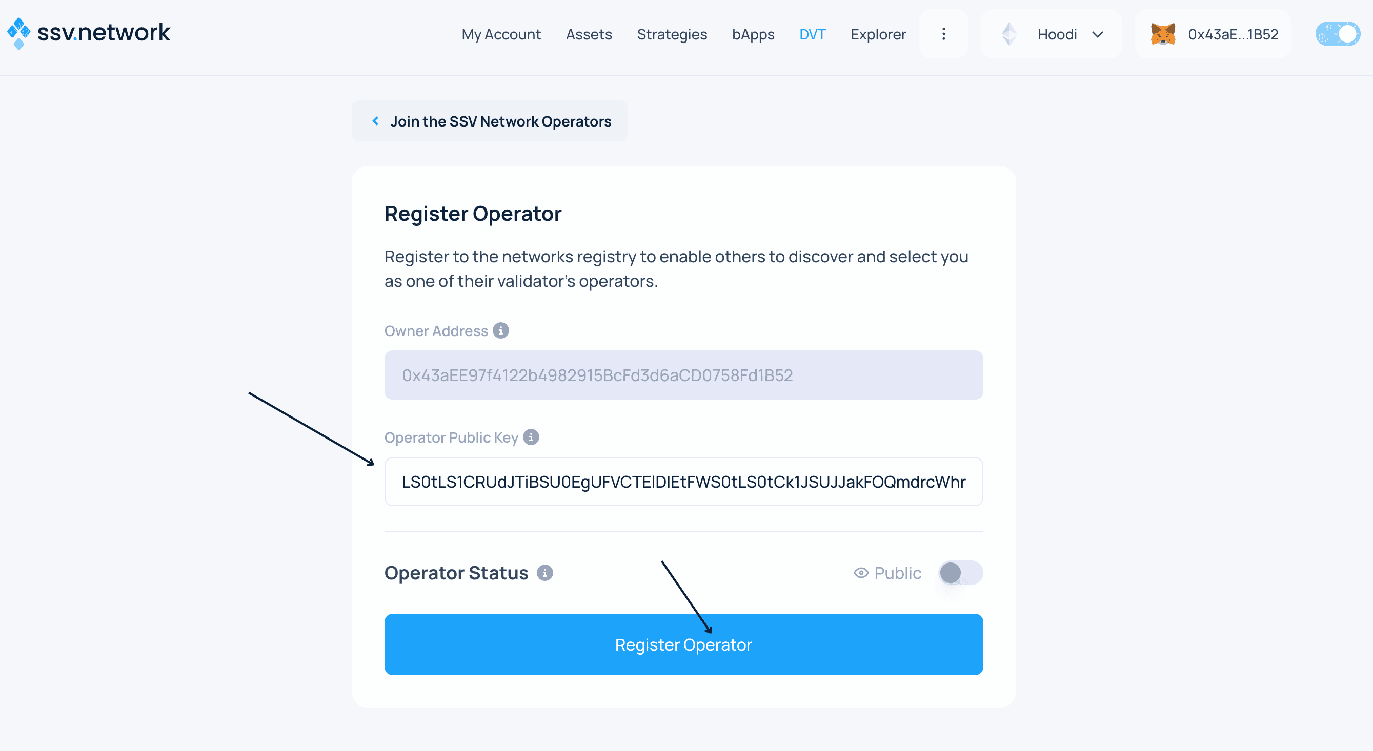 - Paste your Operator Public Key from the previous step and click Register Operator